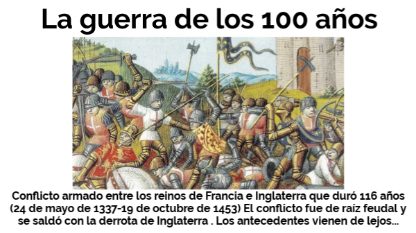 Conflicto armado entre los reinos de Francia e Inglaterra que duró 116 años (24 de mayo de 1337-19 de octubre de 1453) El conflicto fue de raíz feudal y se saldó con la derrota de Inglaterra . Los antecedentes vienen de lejos...