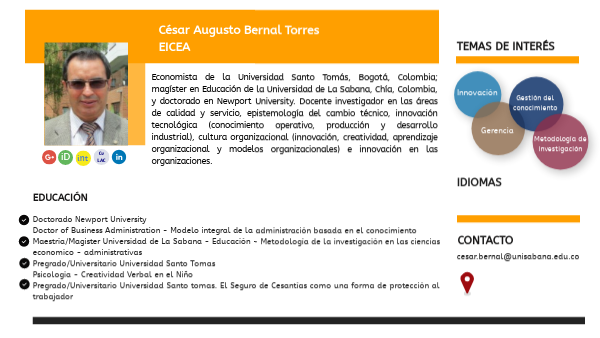 Economista de la Universidad Santo Tomás, Bogotá, Colombia; magíster en Educación de la Universidad de La Sabana, Chía, Colombia, y doctorado en Newport University. Docente investigador en las áreas de calidad y servicio, epistemología del cambio técnico, innovación tecnológica (conocimiento operativo, producción y desarrollo industrial), cultura organizacional (innovación, creatividad, aprendizaje organizacional y modelos organizacionales) e innovación en las organizaciones.