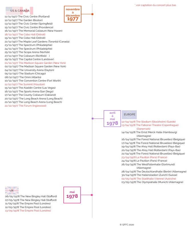 11/11/1977 The Civic Centre (Portland)12/11/1977 The Garden (Boston)13/11/1977 The Civic Center (Springfield)15/11/1977 The Civic Centre (Providence)16/11/1977 The Memorial Coliseum (New Haven)18/11/1977 The Cobo Hall (Détroit)19/11/1977 The Cobo Hall (Détroit)21/11/1977 The Maple Leaf Gardens (Toronto) (Canada)23/11/1977 The Spectrum (Philadelphie)24/11/1977 The Spectrum (Philadelphie)25/11/1977 The Scope Arena (Norfolk)27/11/1977 The Coliseum (Richfield )29/11/1977 The Capital Centre (Landover)01/12/1977 The Madison Square Garden (New York)02/12/1977 The Madison Square Garden (New York)04/12/1977 The University Arena (Dayton)05/12/1977 The Stadium (Chicago)08/12/1977 The Omni (Atlanta)10/12/1977 The Convention Centre (Fort Worth)11/12/1977 The Summit (Houston)15/12/1977 The Aladdin Centre (Las Vegas)16/12/1977 The Sports Arena (San Diego)17/12/1977 The County Coliseum (Oakland)20/12/1977 The Long Beach Arena (Long Beach)21/12/1977 The Long Beach Arena (Long Beach)22/12/1977 The Forum (Inglewood)