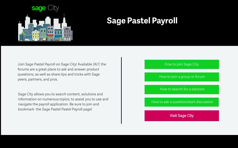 Sage City allows you to search content, solutions and information on numerous topics, to assist you to use and navigate the payroll application. Be sure to join and bookmark the Sage Pastel Pastel Payroll page!