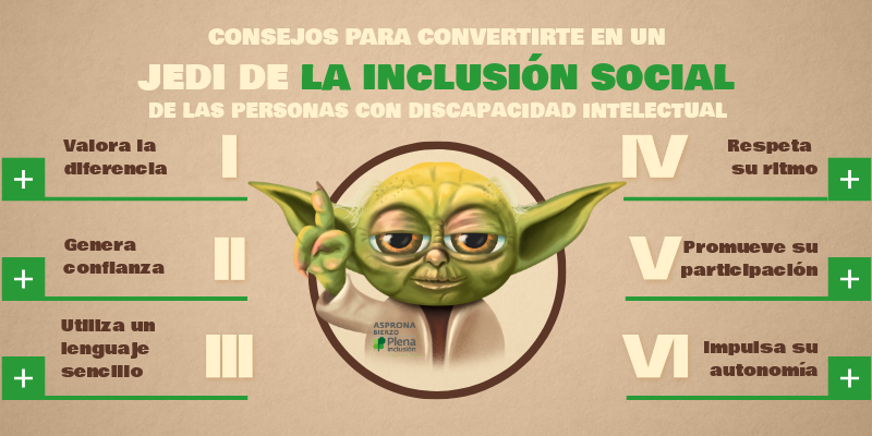 Las personas con discapacidad intelectual necesitan confianza para poder desarrollar 'La Fuerza' que hay en ellos. Si quieres ser un Jedi de la Inclusión Social ayúdales actuando con naturalidad y sencillez, comportándote sin recelo ni temor y también siendo prudente con las manifestaciones excesivas de afecto, poniendo límites necesarios de manera cordial y respetuosa.