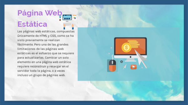 Una página estática muestra siempre la misma información a todos los visitantes y en todo momento. Está hecha básicamente en HTML y CSS. Que sea “estática” no quiere decir que no pueda tener, por ejemplo, animaciones o vídeos. Sólo que esos vídeos y animaciones serán siempre los mismos.