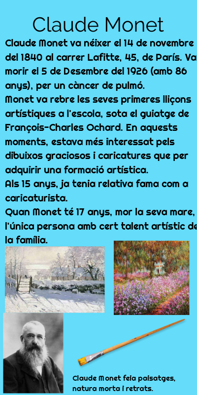 Claude Monet va néixer el 14 de novembre del 1840 al carrer Lafitte, 45, de París. Va morir el 5 de Desembre del 1926 (amb 86 anys), per un càncer de pulmó.Monet va rebre les seves primeres lliçons artístiques a l'escola, sota el guiatge de François-Charles Ochard. En aquests moments, estava més interessat pels dibuixos graciosos i caricatures que per adquirir una formació artística. Als 15 anys, ja tenia relativa fama com a caricaturista. Quan Monet té 17 anys, mor la seva mare, l'única persona amb cert talent artístic de la família.