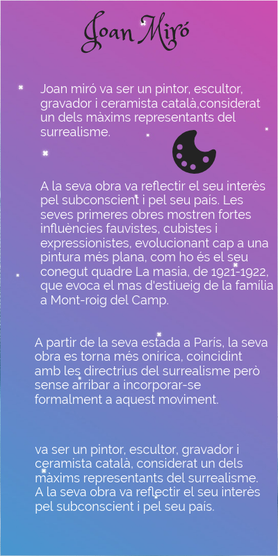 Joan miró va ser un pintor, escultor, gravador i ceramista català,considerat un dels màxims representants del surrealisme.
