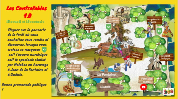Cliquez sur la pancarte de la forêt où vous souhaitez vous rendre et découvrez, lorsque vous croisez ce marqueur soit l'oeuvre numérique soit le spectacle réalisé par Mala6se en hommage à Jean de La Fontaine et à Gudule. Bonne promenade poétique !