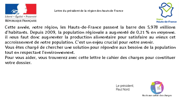 Cette année, notre région, les Hauts-de-France passent la barre des 5,978 millions d'habitants. Depuis 2009, la population régionale a augmenté de 0,21 % en moyenne. il nous faut donc augmenter la production alimentaire pour satisfaire au mieux cet accroissement de notre population. C'est un enjeu crucial pour notre avenir. Vous êtes chargé de chercher une solution pour répondre aux besoins de la population tout en respectant l'environnement. Pour vous aider, vous trouverez avec cette lettre le cahier des charges pour constituer votre dossier.