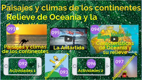 Es un continente formado por Australia y Nueva Zelanda y por otras 3000 islas agrupadas en los siguientes conjuntos:1.- Melanesia, formada por Nueva Guinea, Nueva Caledonia y Nuevas Hébridas 2.- Polinesia, compuesta por las islas del cenro y del sur del océano Pacífico. 3.- Micronesia, al norte de Melanesia que comprende una multitud de pequeñas islas (Marianas y Carolinas) La mayor parte de estas islas tiene un origen volcánico o coralino Australia, con una superficie de 7,6 millones de km2 es la isla más extensa de Oceanía y se extiende entre los