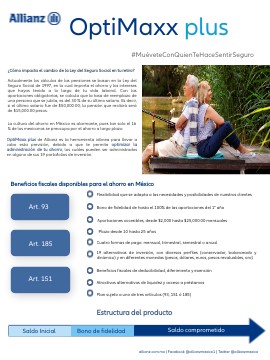 OptiMaxx plus de Allianz es la herramienta idónea para llevar a cabo esta previsión, debido a que te permite optimizar la administración de tu ahorro, los cuáles pueden ser administrados en alguno de sus 19 portafolios de inversión.