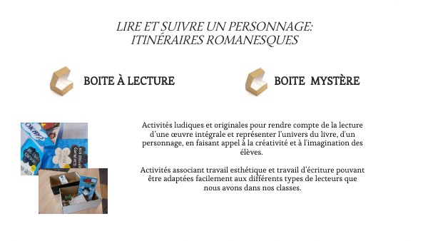 Activités ludiques et originales pour rendre compte de la lecture d’une œuvre intégrale et représenter l’univers du livre, d'un personnage, en faisant appel à la créativité et à l'imagination des élèves. Activités associant travail esthétique et travail d’écriture pouvant être adaptées facilement aux différents types de lecteurs que nous avons dans nos classes.