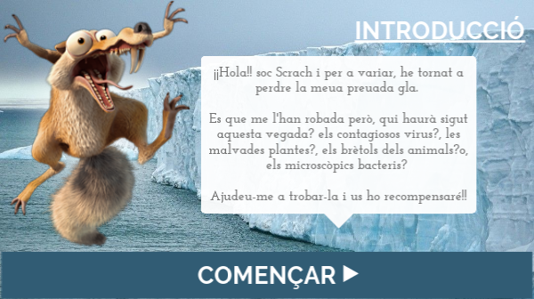¡¡Hola!! soc Scrach i per a variar, he tornat a perdre la meua preuada gla. Es que me l'han robada però, qui haurà sigut aquesta vegada? els contagiosos virus?, les malvades plantes?, els brètols dels animals?o, els microscòpics bacteris? Ajudeu-me a trobar-la i us ho recompensaré!!