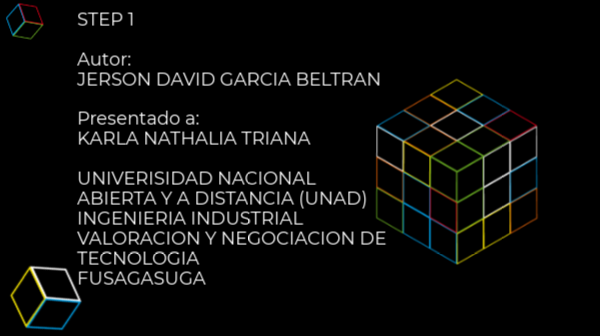STEP 1Autor:JERSON DAVID GARCIA BELTRAN Presentado a:KARLA NATHALIA TRIANA UNIVERISIDAD NACIONAL ABIERTA Y A DISTANCIA (UNAD) INGENIERIA INDUSTRIAL VALORACION Y NEGOCIACION DE TECNOLOGIA FUSAGASUGA
