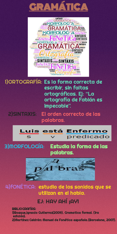 BIBLIOGRAFÍAS: 1)Bosque,Ignacio Gutierrez(2009). Gramatica formal. (1ra edición). 2)Martínez Celdrán: Manual de Fonética española.(Barcelona, 2007).