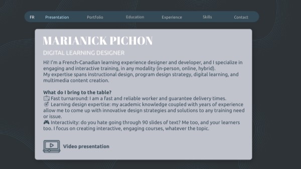 Hi! I'm a French-Canadian learning experience designer and developer, and I specialize in engaging and interactive training, in any modality (in-person, online, hybrid). My expertise spans instructional design, program design strategy, digital learning, and multimedia content creation. What do I bring to the table? 📅 Fast turnaround: I am a fast and reliable worker and guarantee delivery times. 🎯 Learning design expertise: my academic knowledge coupled with years of experience allow me to come up with innovative design strategies and solutions to any training need or issue. 🎮 Interactivity: do you hate going through 90 slides of text? Me too, and your learners too. I focus on creating interactive, engaging courses, whatever the topic.