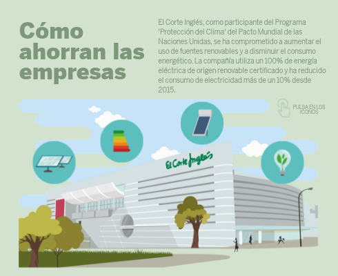 El Corte Inglés, como participante del Programa 'Protección del Clima' del Pacto Mundial de las Naciones Unidas, se ha comprometido a aumentar el uso de fuentes renovables y a disminuir el consumo energético. La compañía utiliza un 100% de energía eléctrica de origen renovable certificado y ha reducido el consumo de electricidad más de un 10% desde 2015.