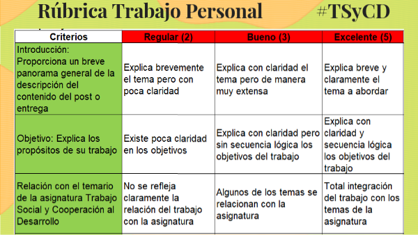 Rubrica de evaluación del Trabajo Personal Obligatorio para las/os estudiantes de la asignatura Trabajo Social y Cooperación al Desarrollo de la Universidad Pontificia Comillas de Madrid