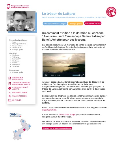 Les élèves découvrent un morceau de corde trouvée sur un terrain de fouille archéologique. Ils ont 45 minutes pour dater cet objet et trouver la clé du Trésor de Lattara. Avec cet Escape Game, Benoît permet aux élèves de découvrir les métiers de l’archéologie et les méthodes de datations d'objets archéologiques. Les élèves sont répartis par groupes. Le trésor de Lattara est fermé par autant de clefs qu’il y a de groupes de travail. En résolvant les énigmes, les élèves construisent leur savoir autour de la datation au carbone 14 et de la décroissance exponentielle. L'âge de l’objet permet d’obtenir une des clefs ouvrant le trésor de Lattara. Benoît nous dévoile le scénario et l'imbrication des énigmes dans cet organigramme. Il s'est inspiré du bric à brac scape pour réaliser notamment l'énigme autour du filtre rouge. Les efforts de mise en scène et le teaser très bien réussi donnent à cet escape Game un aspect très professionnel qui donne envie ! Photos de la séance en classe
