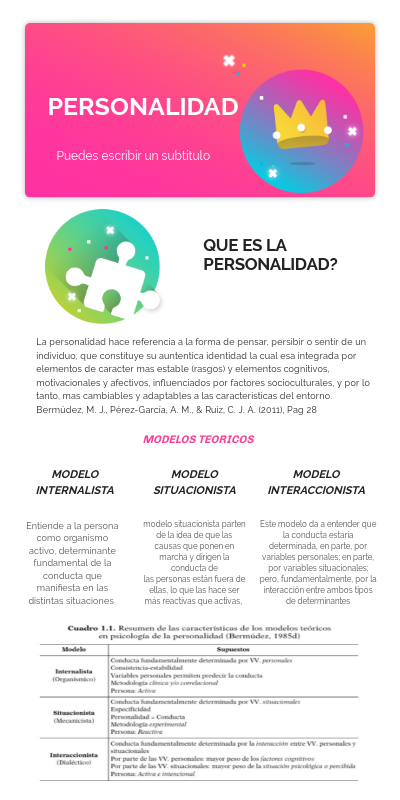 La personalidad hace referencia a la forma de pensar, persibir o sentir de un individuo, que constituye su auntentica identidad la cual esa integrada por elementos de caracter mas estable (rasgos) y elementos cognitivos, motivacionales y afectivos, influenciados por factores socioculturales, y por lo tanto, mas cambiables y adaptables a las caracteristicas del entorno. Bermúdez, M. J., Pérez-García, A. M., & Ruiz, C. J. A. (2011), Pag 28
