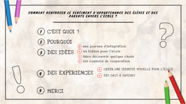 Quelques idées pour renforcer le sentiment d'appartenance des élèves et des parents envers l'école...