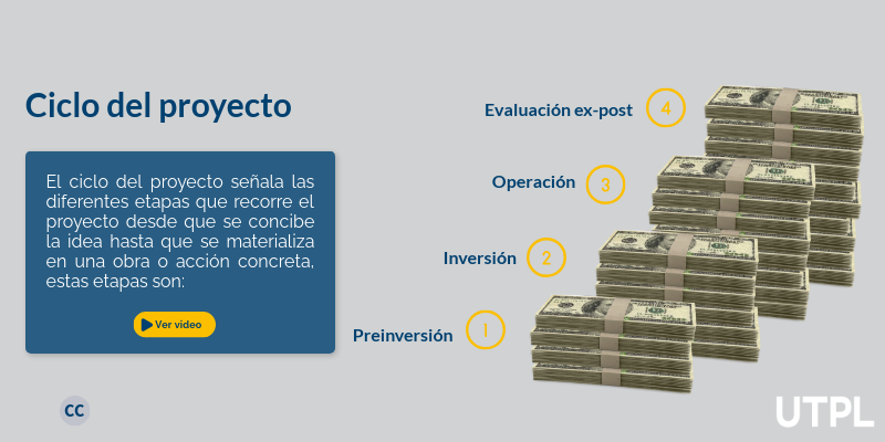 El ciclo del proyecto señala las diferentes etapas que recorre el proyecto desde que se concibe la idea hasta que se materializa en una obra o acción concreta, estas etapas son: