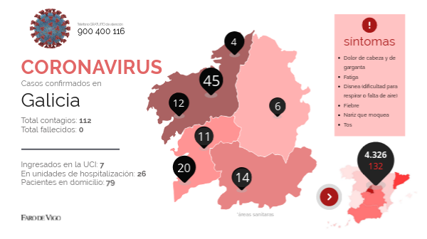 Total contagios: 112 Total fallecidos: 0 Ingresados en la UCI: 7 En unidades de hospitalización: 26 Pacientes en domicilio: 79