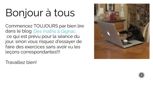 Commencez TOUJOURS par bien lire dans le blog ce qui est prévu pour la séance du jour, sinon vous risquez d'essayer de faire des exercices sans avoir vu les leçons correspondantes!!! Travaillez bien!