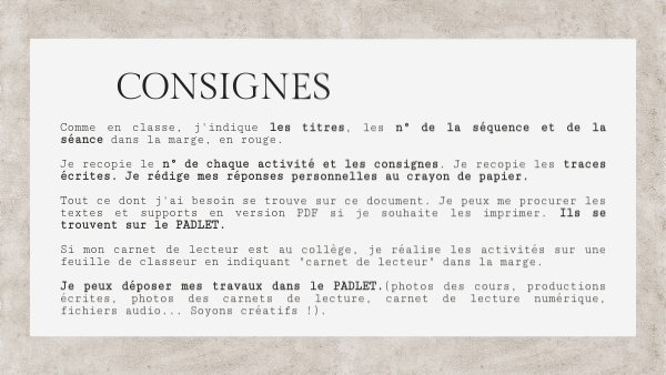 Comme en classe, j'indique les titres, les n° de la séquence et de la séance dans la marge, en rouge. Je recopie le n° de chaque activité et les consignes. Je recopie les traces écrites. Je rédige mes réponses personnelles au crayon de papier. Tout ce dont j'ai besoin se trouve sur ce document. Je peux me procurer les textes et supports en version PDF si je souhaite les imprimer. Ils se trouvent sur le PADLET. Si mon carnet de lecteur est au collège, je réalise les activités sur une feuille de classeur en indiquant "carnet de lecteur" dans la marge. Je peux déposer mes travaux dans le PADLET.(photos des cours, productions écrites, photos des carnets de lecture, carnet de lecture numérique, fichiers audio... Soyons créatifs !).
