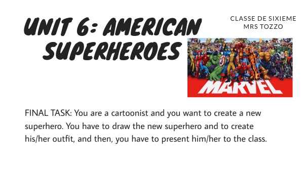 Tu es arrivé à la fin de la séquence, c'est donc l'heure de la tâche finale; tu dois créer ton propre superhéros, et parler de: - Son apparence physique - Son costume - Ses accessoires - Ses pouvoirs - Le comparer avec un autre superhéros. Tu dois réaliser un poster (et donc dessiner ton superhéros) et être capable, à la rentrée, de présenter ce héros au reste de la classe à partir de notes (sans lire ton texte! ENTRAINE TOI). Bon courage! Mrs Tozzo