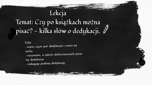 Cele: - wiem, czym jest dedykacja i znam jej cechy - rozumiem, w jakich okolicznościach pisze się dedykacje - redaguję próbną dedykację.