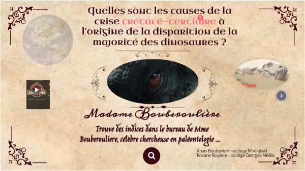 Trouve des indices dans le bureau de Mme Bouberouliere, célèbre chercheuse en paléontologie ....