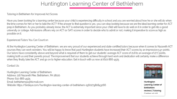 Tutoring in Bethlehem for Improved Act ScoresHave you been looking for a learning center because your child is experiencing difficulty in school and you are worried about how he or she will do when the time comes for him or her to take the ACT? If the answer to that question is yes, you can stop looking because we are the ideal learning center for ACT prep in Bethlehem. As you probably already know, the ACT is extremely important since your child will have to do well on it in order to get into a good university or college. Admissions officers rely on ACT (or SAT) scores in order to decide who to admit or not, making it imperative to score as high as possible on it.Experienced Tutors You Can Count onAt the Huntington Learning Center of Bethlehem, we are very proud of our experienced and state-certified tutors because when it comes to Nazareth ACT courses they can work wonders. You will be happy to know that past Huntington students have increased their ACT scores by an impressive 5.9+ points. Our tutors have consistently above and beyond what is required of them to get our students’ average ACT score of 21.8 to an average of 27.7 points, making both us and their parents proud. The improvement that our students achieve through hard work and dedication will certainly make a difference when they finally take the ACT and go on to higher education. Get in touch with us now at (610) 866-4525Contact Us:Huntington Learning Center of BethlehemAddress: 216 Nazareth Pike, Bethlehem, PA 18020Phone: 610-866-4525Email: bethlehempa@hlcmail.com Website: https://birdeye.com/huntington-learning-center-of-bethlehem-156027980843066