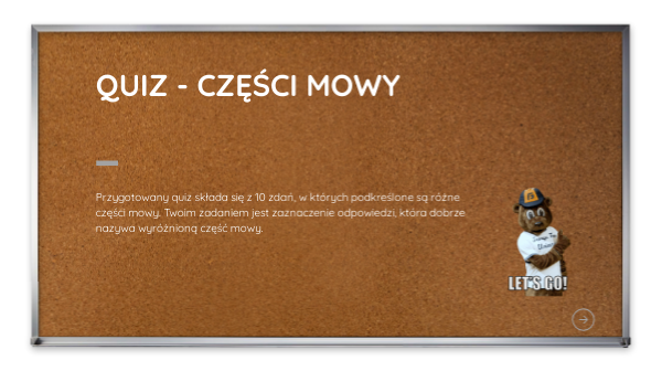 Przygotowany quiz składa się z 10 zdań, w których podkreślone są różne części mowy. Twoim zadaniem jest zaznaczenie odpowiedzi, która dobrze nazywa wyróżnioną część mowy.