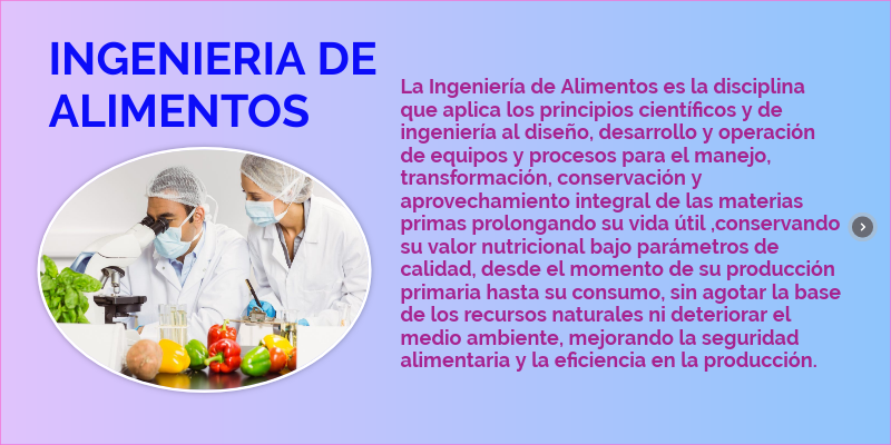 La Ingeniería de Alimentos es la disciplina que aplica los principios científicos y de ingeniería al diseño, desarrollo y operación de equipos y procesos para el manejo, transformación, conservación y aprovechamiento integral de las materias primas prolongando su vida útil ,conservando su valor nutricional bajo parámetros de calidad, desde el momento de su producción primaria hasta su consumo, sin agotar la base de los recursos naturales ni deteriorar el medio ambiente, mejorando la seguridad alimentaria y la eficiencia en la producción.