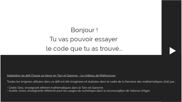 Adaptation du défi Chasse au trésor en Tarn et Garonne - Le château de MathenscenToutes les énigmes utilisées dans ce défi ont été imaginées et réalisées dans le cadre de la Semaine des mathématiques 2020 par : • Cédric Gros, enseignant référent mathématiques dans le Tarn-et-Garonne • Aurélie Jones, enseignante référente pour les usages du numérique dans la circonscription de Valence d'Agen