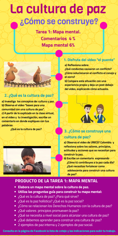 a) Investiga los conceptos de: cultura y paz.b) Observa el video "bases para una comunidad con una cultura de paz". c) A partir de lo explicado en la clase virtual, en el video y tu investigación, escribe un comentario en donde expliques con tus palabras: ¿Qué es la cultura de paz?