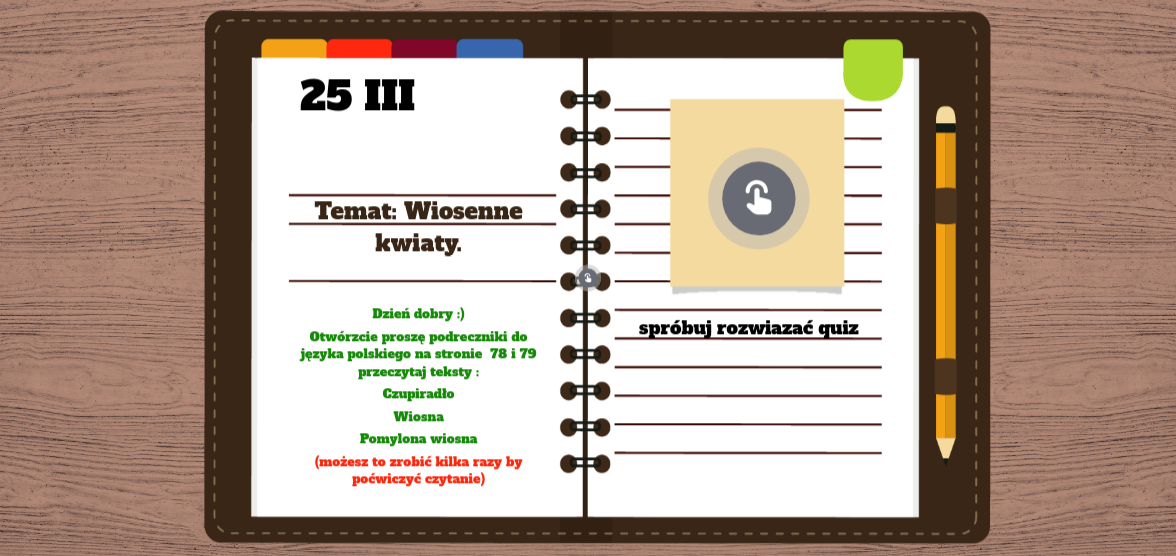 Dzień dobry :) Otwórzcie proszę podreczniki do języka polskiego na stronie 78 i 79 przeczytaj teksty : Czupiradło Wiosna Pomylona wiosna (możesz to zrobić kilka razy by poćwiczyć czytanie)