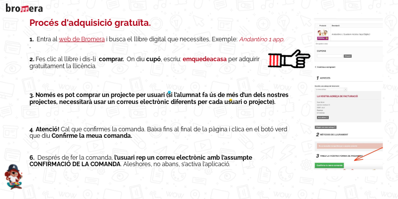 1. Entra al web de Bromera i busca el llibre digital que necessites. Exemple: Andantino 1 app., 2. Fes clic al llibre i dis-li comprar. On diu cupó, escriu: emquedeacasa per adquirir gratuïtament la llicència.