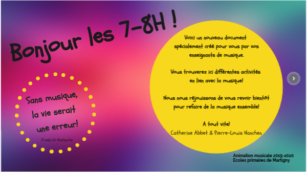 Voici un nouveau document spécialement créé pour vous par vos enseignants de musique. Vous trouverez ici différentes activités en lien avec la musique! Nous nous réjouissons de vous revoir bientôt pour refaire de la musique ensemble! A tout vite! Catherine Abbet & Pierre-Louis Nanchen