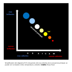 Simplificación del diagrama H-R, incluyendo sólo las estrellas de la secuencia principal, se puede ver la relación, brillo, temperatura y tamaño. Crédito: Borja Tosar