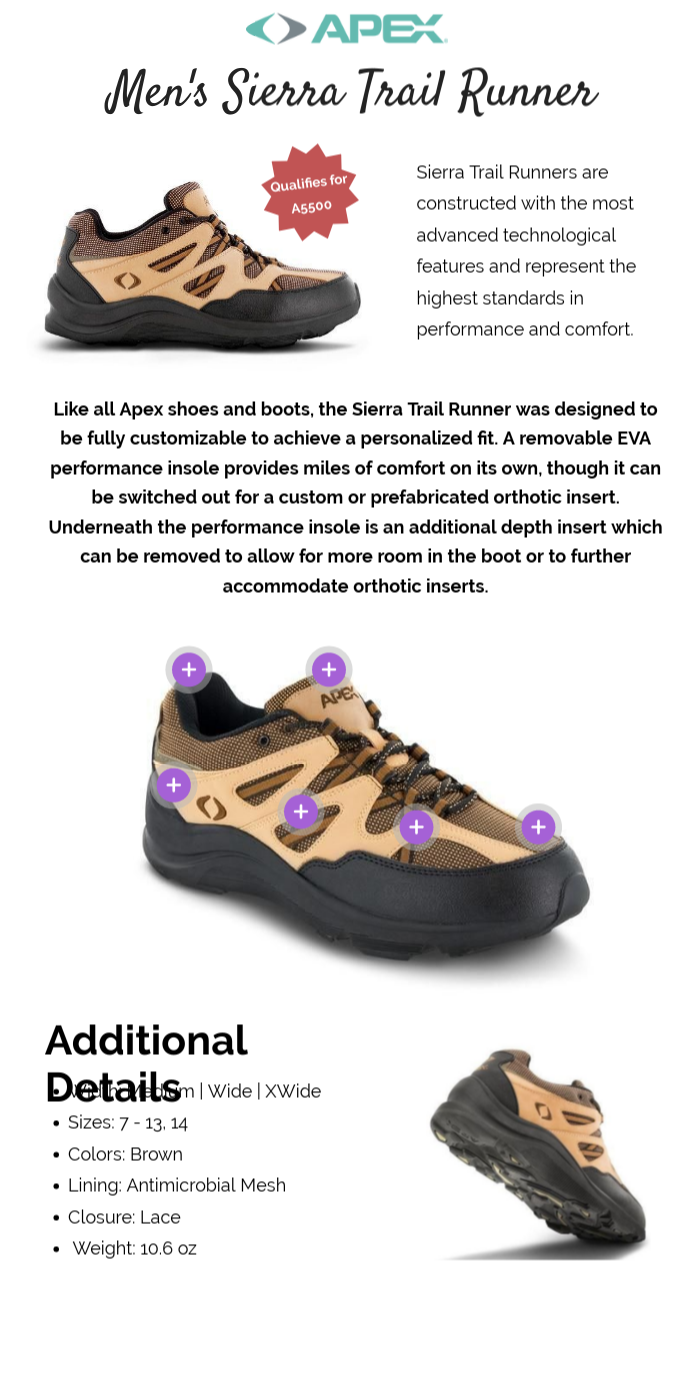 Apex Men's Sierra Trail Runner, Diabetic Therapeutic footwear