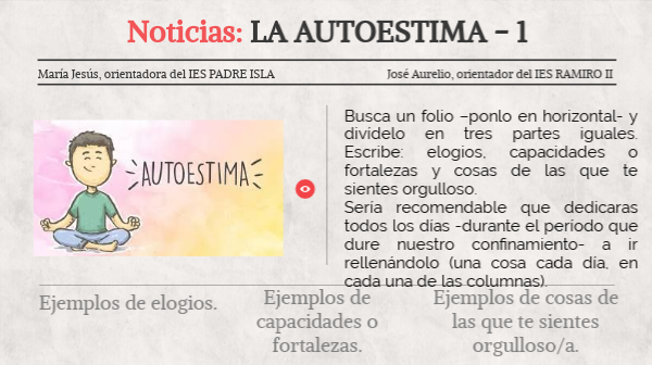 Busca un folio –ponlo en horizontal- y divídelo en tres partes iguales. Escribe: elogios, capacidades o fortalezas y cosas de las que te sientes orgulloso.Sería recomendable que dedicaras todos los días -durante el período que dure nuestro confinamiento- a ir rellenándolo (una cosa cada día, en cada una de las columnas).