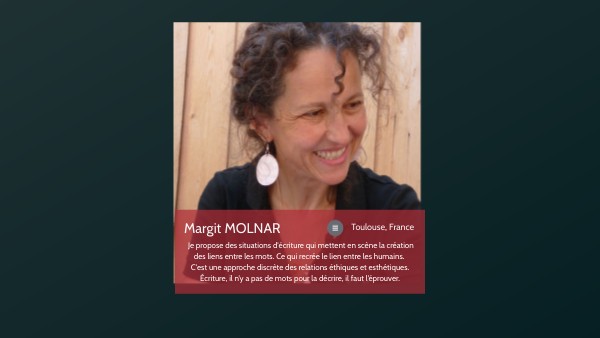 Je propose des situations d'écriture qui mettent en scène la création des liens entre les mots. Ce qui recrée le lien entre les humains. C'est une approche discrète des relations éthiques et esthétiques. Écriture, il n’y a pas de mots pour la décrire, il faut l’éprouver.