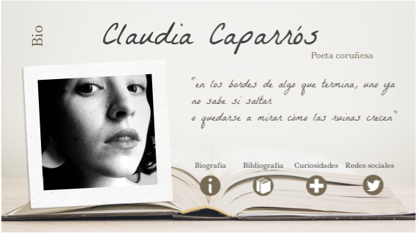Claudia González Caparrós nació en 1993, en A Coruña. Es graduada en Estudio Literarios y cursó un máster en Historia del Arte contemporáneo y Cultura Visual, en Madrid, y otro en Literaturas Hispánicas, en Indiana. Ha publicado dos poemarios: Si la carne es hierba (Sully Morland) (La Bella Varsovia, 2015) y Te miro con quien asiste a un deshielo (La Bella Varsovia, 2018). Actualmente, Claudia codirige un proyecto a tres llamado crisi: Espacio de pensamiento crítico.