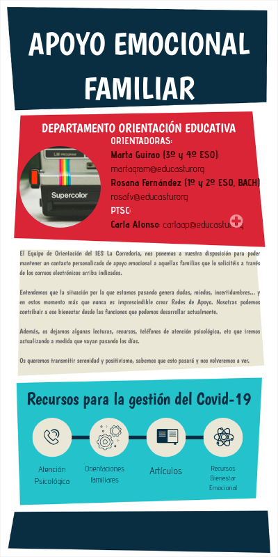 El Equipo de Orientación del IES La Corredoria, nos ponemos a vuestra disposición para poder mantener un contacto personalizado de apoyo emocional a aquellas familias que lo solicitéis a través de los correos electrónicos arriba indicados. Entendemos que la situación por la que estamos pasando genera dudas, miedos, incertidumbres... y en estos momento más que nunca es imprescindible crear Redes de Apoyo. Nosotras podemos contribuir a ese bienestar desde las funciones que podemos desarrollar actualmente. Además, os dejamos algunas lecturas, recursos, teléfonos de atención psicológica, etc que iremos actualizando a medida que vayan pasando los días. Os queremos transmitir serenidad y positivismo, sabemos que esto pasará y nos volveremos a ver.