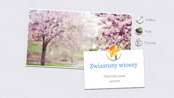Wiosna - jedna z czterech podstawowych pór roku w przyrodzie. Pierwszy dzień wiosny obchodzony jest 21 marca, tego dnia dzień i noc mają po 12 godzin. Od tej pory dni będą coraz dłuższe i cieplejsze.