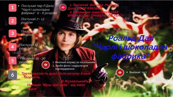 - Послухай твір Р.Дала "Чарлі і шоколадна фабрика" (1 - 6 розділи)