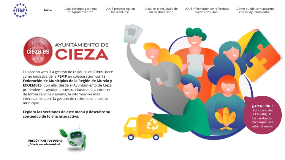 La sección web "La gestión de residuos en Cieza" nace como iniciativa de la FEMP en colaboración con la Federación de Municipios de la Región de Murcia y ECOEMBES. Con ella, desde el Ayuntamiento de Cieza pretendemos ayudar a nuestra ciudadanía a conocer, de forma sencilla y amena, la información más interesante sobre la gestión de residuos en nuestro municipio. Explora las secciones de este menú y descubre su contenido de forma interactiva.