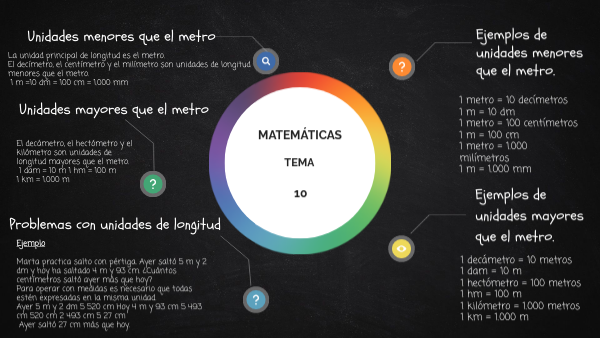 1 metro = 10 decímetros1 m = 10 dm 1 metro = 100 centímetros 1 m = 100 cm 1 metro = 1.000 milímetros 1 m = 1.000 mm