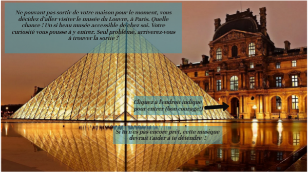 Ne pouvant pas sortir de votre maison pour le moment, vous décidez d’aller visiter le musée du Louvre, à Paris. Quelle chance ! Un si beau musée accessible de chez soi. Votre curiosité vous pousse à y entrer. Seul problème, arriverez-vous à trouver la sortie ?