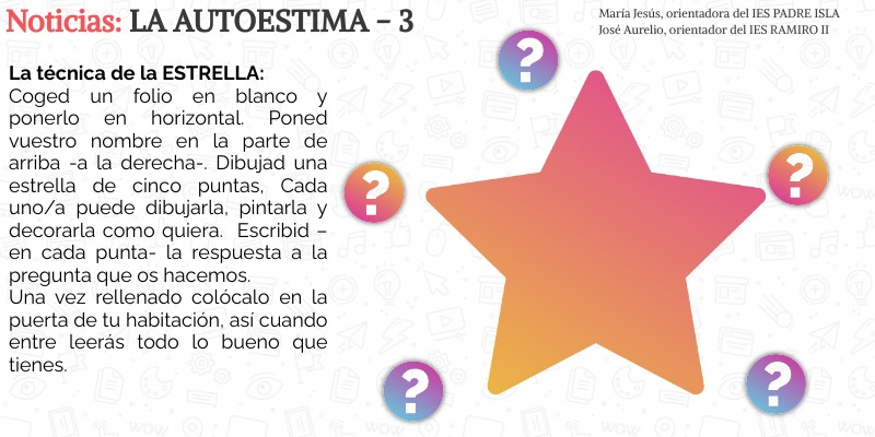 La técnica de la ESTRELLA:Coged un folio en blanco y ponerlo en horizontal. Poned vuestro nombre en la parte de arriba -a la derecha-. Dibujad una estrella de cinco puntas, Cada uno/a puede dibujarla, pintarla y decorarla como quiera. Escribid –en cada punta- la respuesta a la pregunta que os hacemos. Una vez rellenado colócalo en la puerta de tu habitación, así cuando entre leerás todo lo bueno que tienes.