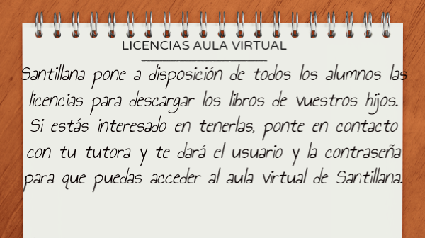 Santillana pone a disposición de todos los alumnos las licencias para descargar los libros de vuestros hijos.Si estás interesado en tenerlas, ponte en contacto con tu tutora y te dará el usuario y la contraseña para que puedas acceder al aula virtual de Santillana.